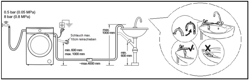 - Die Höhe des Ablaufs darf nicht mehr als 100 cm über und nicht weniger als 60 cm oberhalb der Gerätebasis liegen, beachten Sie dabei den Hinweis in der .