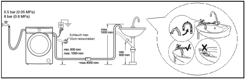 Il tubo di scarico non deve sporgere più di 10 cm nello scarico. Se il tubo di drenaggio non è ventilato, l'unità sarà drenata. Per ulteriori informazioni, vedere le istruzioni di installazione nel o le istruzioni di installazione separate per il vostro apparecchio.